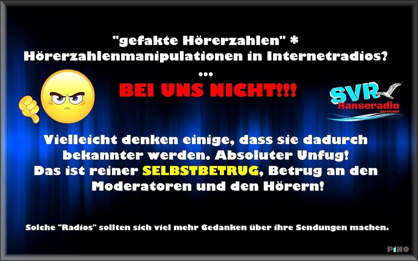 Wir sind immer bestrebt, alle/die meisten Hörerwünsche zu erfüllen und brauchbare Audioaufnahmen anzubieten. ABER wir bieten KEINE Musiktitel oder/und Wortbeiträge an, die auf dem sogenannten "Index" stehen bzw. gegen gesetzliche Bestimmungen verstoßen. Kritik an Politik: ja ... hier allerdings in satirischer Form! Das Thema Religion ist bei uns zu 100 % tabu - egal in welcher Form! Unsere Richtlinie besteht darin, alle Veröffentlichungen zu blockieren, die durch Musik und Text auf der Veröffentlichung selbst in erster Linie erstellt werden, um gewalttätigen Hass gegen Personengruppen auf der Grundlage von Faktoren wie ihrer ethnischen, kulturellen, religiösen oder sexuellen Identität zu schüren, oder in Bezug auf körperliche oder geistige Gesundheit. Die Entscheidung liegt in unserem alleinigen Ermessen. (P.S. Sogenannte "autorisierte" bzw. von den Künstlern selbst veröffentlichte "Mashups" sind nicht verboten, bei "Bootlegs" dagegen machen wir aber "dicht", hierbei handelt es sich um eindeutige Urheberrechtsverletzungen...). Auch: "Hörerzahlenmanipulationen", wie es in vielen anderen Radios fast üblich ist, sind bei uns verboten und auch garnicht möglich! Denn das ist/wäre Selbstbetrug und gesetzlich sehr fragwürdig, kann geahndet werden. Wer sowas macht, belügt sich nicht nur selbst, sondern auch Kollegen und Hörer! Sollte ich dennoch so etwas bemerken, wird von meiner Seite aus SOFORT gehandelt ... ohne Vorwarnung!